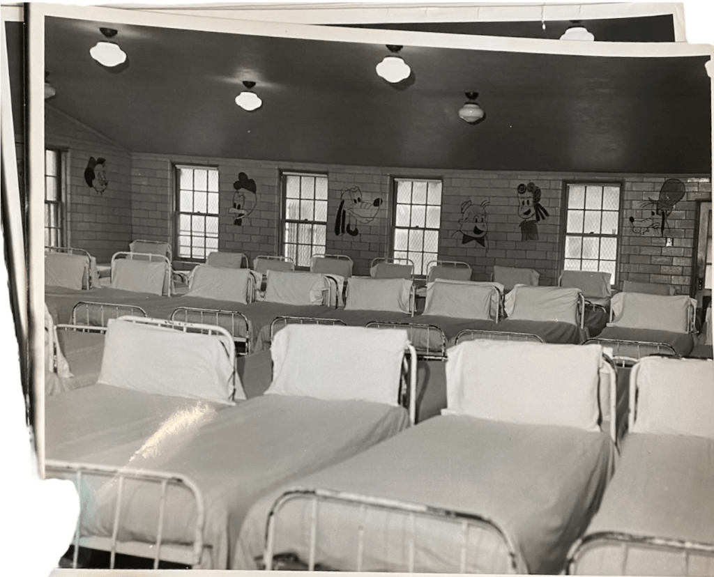 A photo of the Merritt Dorm in 1956. The floor is tiled and the walls are painted brick. There is a drain visible on the floor. There are short walls organized in a cubicle- formation. There are no doors to the cubicles. In each cubicle, there are three beds to a “wall”, with a nightstand and a chair dividing them. The chair is in front of the nightstand. This is a picture of a dorm called the Merritt Dorm, from 1956 which is better than the children’s dorm, with at least wall structures present, but it is still not adequate. Better than nothing is still not good. There is still a complete lack of privacy, just assuaged a bit by the cubicle-style walls. It still does not look like a home or even a dorm—still no privacy, a feeling of overcrowdedness, and blank walls.