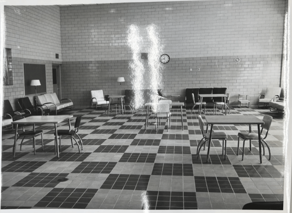 The day room of Merritt Hall in the 1950s. It has a black and white checkered floor and painted brick or cinderblock walls. The visible walls are bare save for a clock and a small blackboard. The furniture is concentrated on the edges of the room. There are three tables scattered in the middle of the room, each with two chairs. It is also interesting considering the largeness of the superintendent’s home. It has pillars, a feature that tends to be associated with power and wealth, but the residents can’t have two feet of space between the beds? Can’t have stall doors in the bathroom? When placed side by side it is disturbing to see the differences. MTS was a home for its residents. Many didn’t have the option to go anywhere else if they found their lodgings less than satisfactory. For those who had entered the institution as young children or toddlers, MTS was the only home they had ever really known. For those unequipped by the system with the tools to leave, there were not many options available. For children, even less so, as some were wards of the state and given no choice concerning where they lived. Some residents had medical needs that stopped them from leaving, as the resources were not available outside the institution. They were living in a system that pushed them towards institutionalization and then failed to support them once they were admitted. A system that did not value choice and freedom.