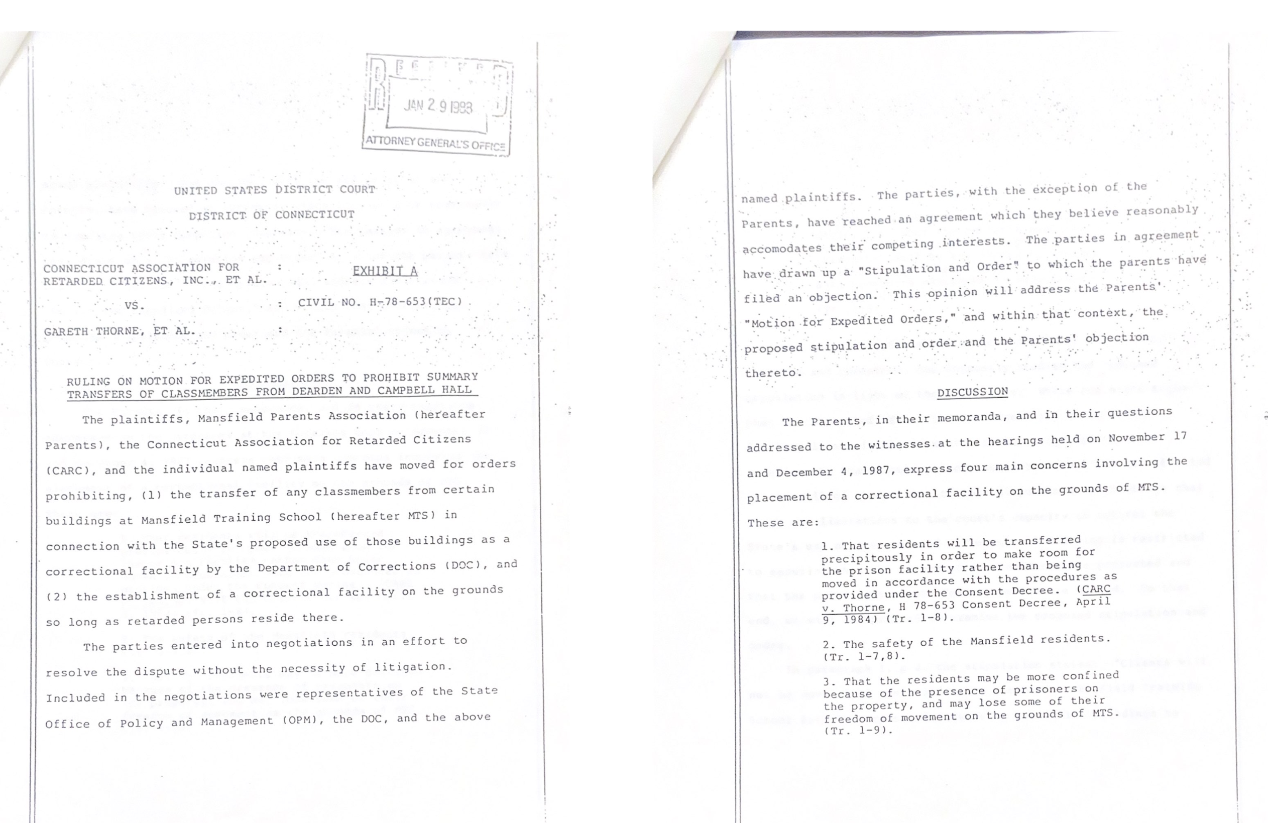 Throughout time, The Arc has advocated to “the passage of state and federal legislation on behalf of people with disabilities and established a broad network of state and local chapters…” (“History of the Arc”). The Arc also continues to acknowledge the history of its name throughout time expressing that “Words matter. Over time, as the word ‘retardation’ became pejorative, derogatory, and demeaning in usage, the organization evolved its terminology to reflect the desires of people with disabilities, and changed its name to “The Arc” (“History of the Arc”). The motion made against the transfer of individuals at MTS by what was known as CARC and the Mansfield Parents Association (Parents), would align with this organization’s mission, at this time, being providing legislative support to people with disabilities, which explains their recent involvement in the school. The plaintiffs of this case moved for order prohibiting (1) the transfer of any class members (residents) from certain buildings at MTS in connection with the State’s proposed use of those buildings as a correctional facility by the DOC and (2) the establishment of a correctional facility on the grounds of MTS as long as residents reside there. However, the parties, with exception of the Parents, believe they had reached an agreement in which they will draw up a “Stipulation and Order” to address the Parents’ “Motion for Expedited Orders.” In their discussion, the Parents have expressed four main concerns with the placement of a correctional facility on the MTS grounds.