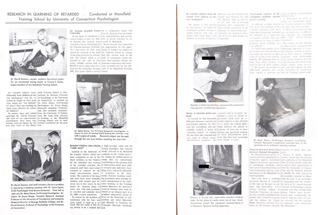 During the height of this abuse, back in the mid to late sixties, the University of Connecticut continued to cultivate their bond with MTS. UConn sent their students there. They worked there and researched there. One key faculty member from UConn that spent a majority of his time at MTS was Psychology professor David Zeaman. In an article detailing Zeaman’s work, it mentions that Zeaman had been conducting research at MTS for 9 years with the assistance of 6 other experimental psychologists. Due to his innovative research, he was awarded a Career Fellowship by the National Institute of Health, which was the first such award for research in the field of learning processes in the field. The award was a salary of $88,705 ($685,750.08 today), intended to cover Zeaman through 1968. This grant would ‘free’ Zeaman from his teaching responsibilities and allow him to do full time research at MTS.