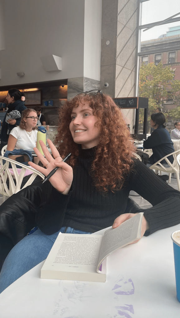 Image Description: a white femme-presenting person with long curly ginger hair and eyeglasses on their head. They are wearing blue jeans and a black turtle neck sweater. In their right hand is a pen and they’re waving at the camera while looking into the distance. They are also reading a book in a coffee shop with a chai latte.