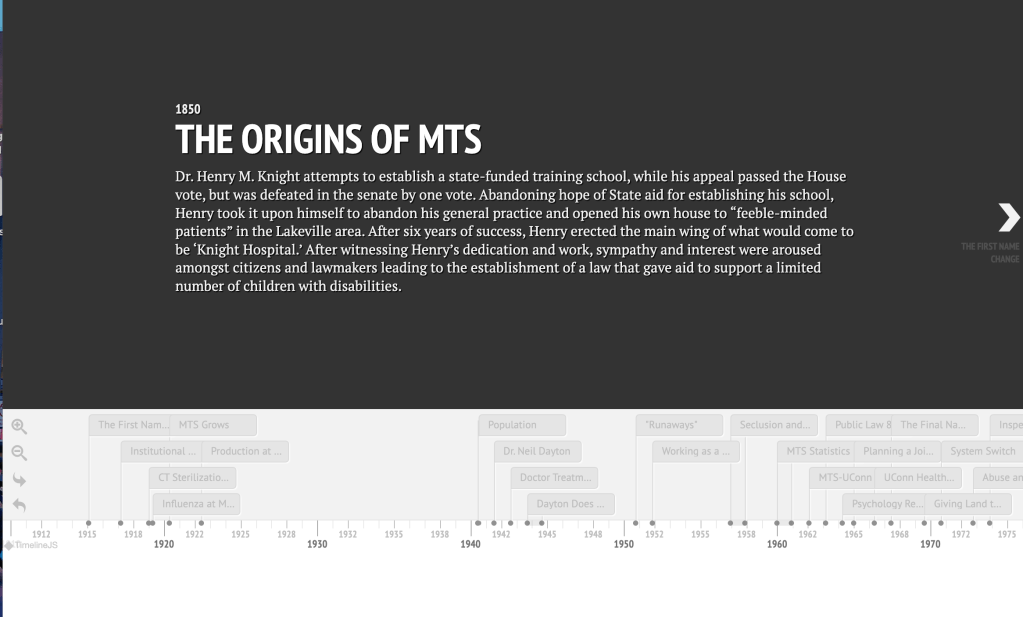 This timeline depicts some of the main points of Mansfield Training School’s over 100-year history, serving as a guiding point for the institution’s existence and contextualizing some of the documents and stories we explore. Click on the image below to access the full MTS timeline: