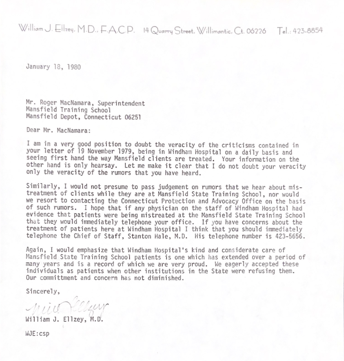The interconnectedness of MTS and all state-run institutions to Connecticut’s hospitals is one of the few reasons why some residents were able to receive any care whatsoever. If a resident experienced a symptom or illness where they could not be treated at MTS, they were often sent to Windham Hospital, or any other in the state that would accept them. The beginning of the 1980’s saw the relationship between MTS and Windham Hospital begin to be strained. Dr. William Ellzey, a physician at Windham, felt attacked by concerns brought to him by Superintendent MacNamara regarding the treatment of MTS clients at the hospital brought to him by an unknown source. MacNamara, concerned with the way his residents were being treated, offered points of criticism to the hospital. Dr. Ellzey writes of the ‘rumors’ as simply hearsay that were blown out of proportion.
